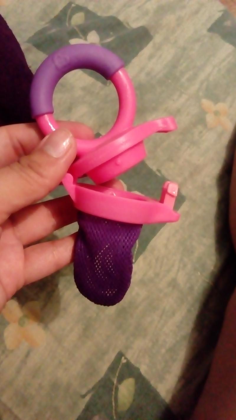 Este es el segundo que tengo y está bastante bien. Metes la fruta dentro, el bebé la chupa y se sale por la rejilla, lo malo que tiene es que es muy difícil de limpiar. Yo le acababa metiendo a veces incluso en la lavadora. Me gusta más el que es de silicona -