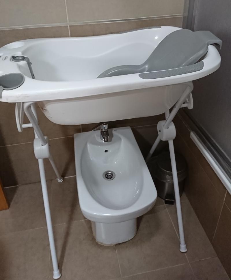Es un gran aliado a la hora del baño, tamaño perfecto para el bebé, incorpora un pequeño acople tipo silla para que el bebé quede acomodado, se sujeta con ventosas que quitaremos al crecer; para que a los padres no nos duela la espalda en el proceso del baño, dispone de un soporte básico pero seguro que se puede plegar.