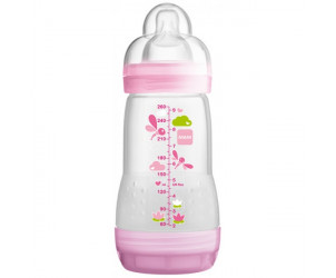 Biberón Anti-cólicos de MAM, de cuello largo, 260ml. Ideal para los bebés desde el nacimiento. Con tetina suave para un flujo constante al beber. Su válvula de fondo se ocupa de que los cólicos se reduzcan en un 80% de los casos.