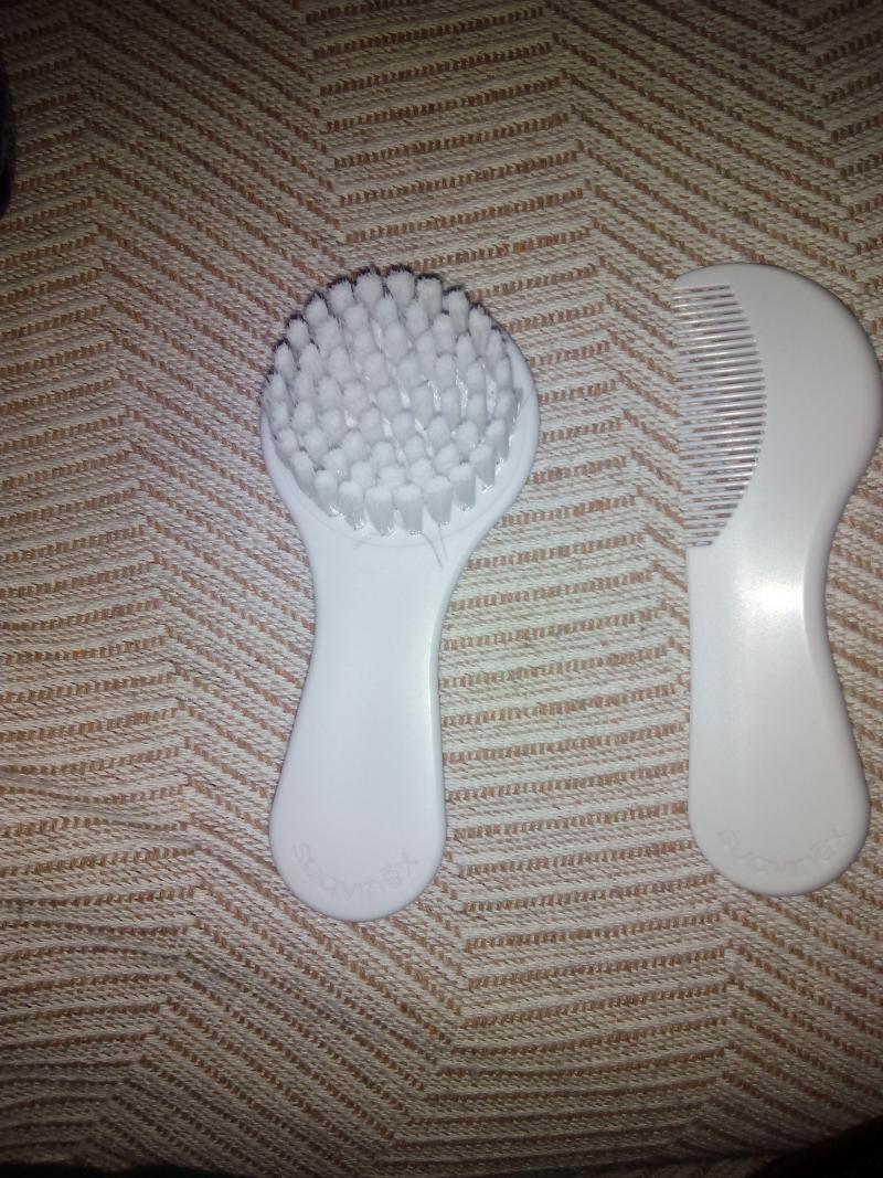 Nos regalaron este conjunto de peine y cepillo y ha sido de gran utilidad ya que los usamos a diario y para después de cada baño. Son resistentes, duros y delicados - Ventajas: