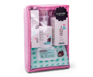 Compuesta de loción hidratante de 400ml, crema del pañal, Baby Cologne y un paquete de toallitas de 72 unidades. Presentados todos en una bonita cesta con interior forrado de tela. ¡Un regalo práctico y bonito a la vez!