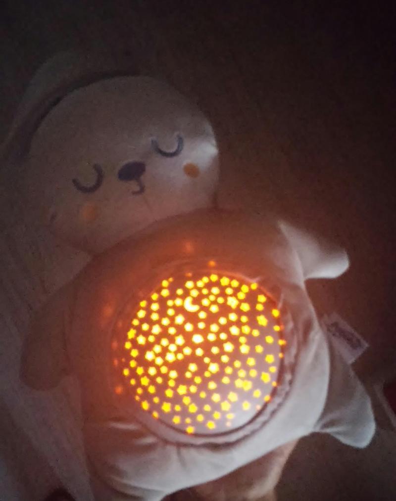 Nos encanto en cuanto lo vimos y nuestro bebé se enamoró de él desde que se lo pusimos en la cuna. Se queda alucinada con las estrellitas que llenan toda su cuna. Además puedes lavar el peluche solo porque donde van las pilas y las luces va independiente. Lo único que cambiaríamos sería que la melodía fuera más larga, se nos hace cortita para dormirla. - Ventajas: