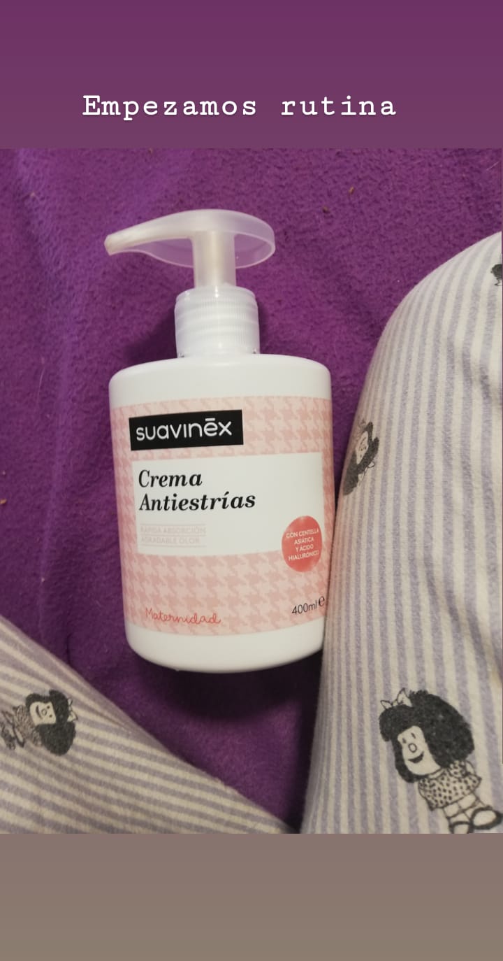 Empecé a utilizar esta crema antiestrías de Suavinex durante mi primer embarazo. Me gustó mucho porque se extiende muy fácilmente, tiene un aroma agradable, hidrata muy bien y no resulta nada pastosa. Con el tiempo la tripita fue creciendo y la verdad es que tengo que decir que no me salió ninguna estría, nada de nada. Eso sí, hay que ser muy constante y usarla a diario, pero merece la pena porque la barriga te queda fenomenal después del embarazo, y durante, notas como aunque se estire la piel, no está tirante porque la tienes bien hidratada.