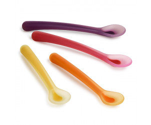 Cucharas de silicona que facilitan el inicio de la transición de la alimentación con biberón al plato. Su punta suave y flexible está diseñada para las encías sensibles de los pequeños, mientras que su textura antideslizante conrtibuye a evitar que se caiga, si es el bebé quien come solito, facilitando su uso.