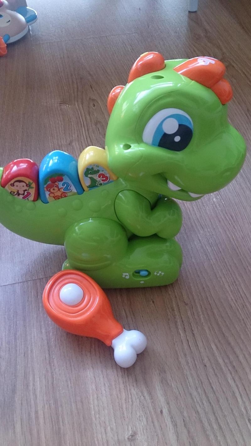 El dinosaurio dientecitos es genial,no para un momento y al peque y a mí nos encanta! Lo puedes poner con sonido o con sonido y movimiento, que es el que nosotros ponemos siempre. Canta, habla, hace ruidos de animales, juega al pilla pilla, corre,.. Tiene de todo para que el niño no se aburra. También tiene un sonajero con forma de muslo de pollo - Ventajas: