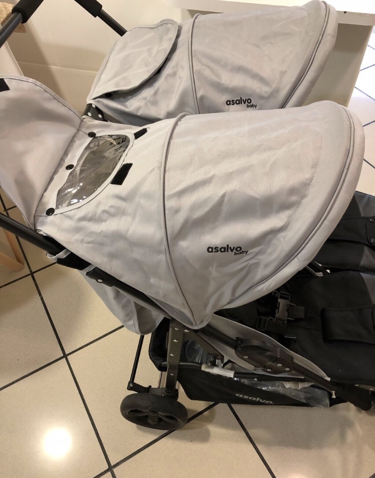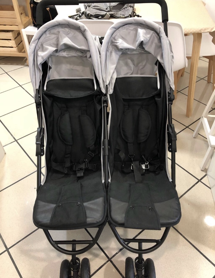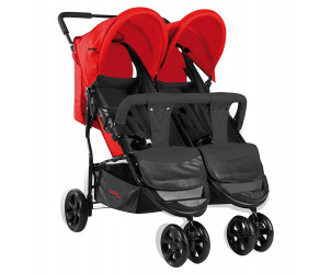 Silla de paseo gemelar para pequeños de la misma edad o de edades similares. Con dos ruedas delanteras para una mejor maniabilidad y dos barras frontales para cada una de las sillas. Marco de acero resistente y robusto.