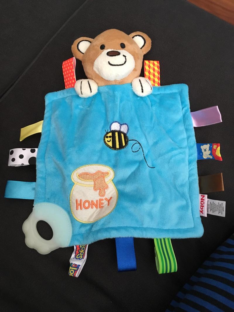 Es un cuadrado de 20cm, es un poco pequeño para mi gusto, tiene cintas por los lados que sobresalen y por uno de los lados tiene la cara y patas de un osito, que al estar perfilado en marrón oscuro hace que mi peque se quede innotizada mirándole.