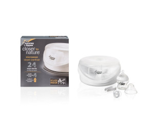Esterilizador Closer to Nature de Tommee Tippee con una capacidad para cuatro biberones y sus accesorios. Esteriliza totalmente en tan solo 4-8 minutos. Guarda todos los utensilios estériles durante 24 horas si no se destapa, para poder ponerlo por la noche y encontrar los biberones listos para usar a la mañana siguiente.