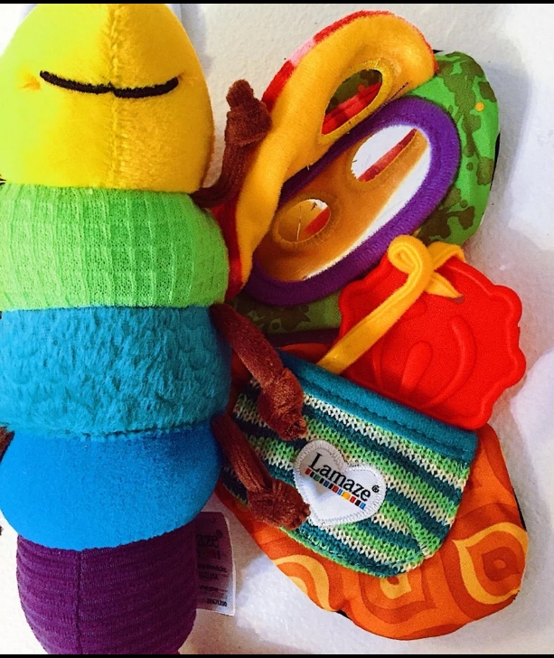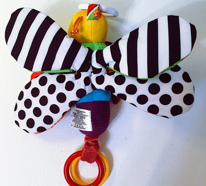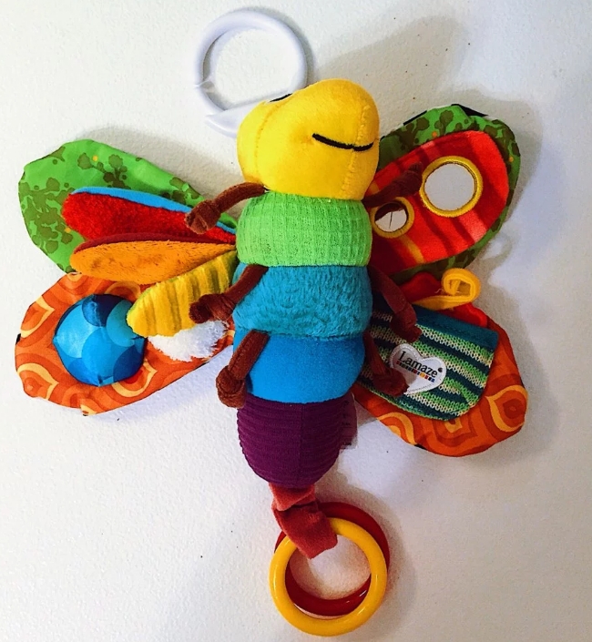 Diferentes texturas en las alas y el cuerpo y muy colorido, desde el primer día le llamo la atención, la pinza es fácil y cómodo de colgar en el carro, la cuna, la hamaca....., el espejo le hace mucha gracia y el mordedor esta siendo lo más usado ahora que empieza a asomar una puntita blanca en la encía de abajo