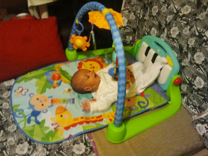 Gimnasio y piano pataditas de Fisher Price. El niño da pataditas y hace que suene la música.