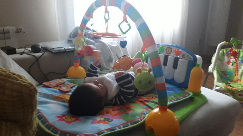 Gimnasio y piano pataditas de Fisher Price. El niño da pataditas y hace que suene la música.