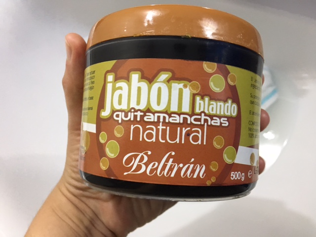 Me recomendaron este jabón una época en la que mi bebé empezaba a manchar baberos y ropita con fruta y comida, y también a tener escapes de caquita del pañal, con lo que la ropa se ponía perdida. Como no quería usar lejía o productos de oxígeno activo en algunas prendas de bebé, lo probé. La textura del jabón es gelatinosa, bastante difícil de coger y dosificar. Frotando en la mancha se queda ahí pegado y hace poquita espuma, así que mejor terminar de lavar la prenda en la lavadora para que se aclare bien. Lo mejor es aplicarlo sobre la mancha muy reciente, y aún así no siempre es tan efectivo, hay algunas manchas que siguen dejando la sombra cuando ya están lavadas. Y sobre las manchas de caquitas, al final acabé utilizando blanqueantes.