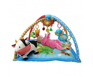 Se lo regalaron mis padres en sus primeros reyes magos cuando tenia 3 meses, y lo ha usado muchísimo, ellos interactúan mucho con los juguetes que están colgados y tiene melodias, canciones habladas, ruidos de animales, y se puede estirar, tiene un peluche de vaca super suave que se puede poner a la altura del niño, y es facil de colocar, la alfombra es blandita y fácil de lavar - Ventajas: