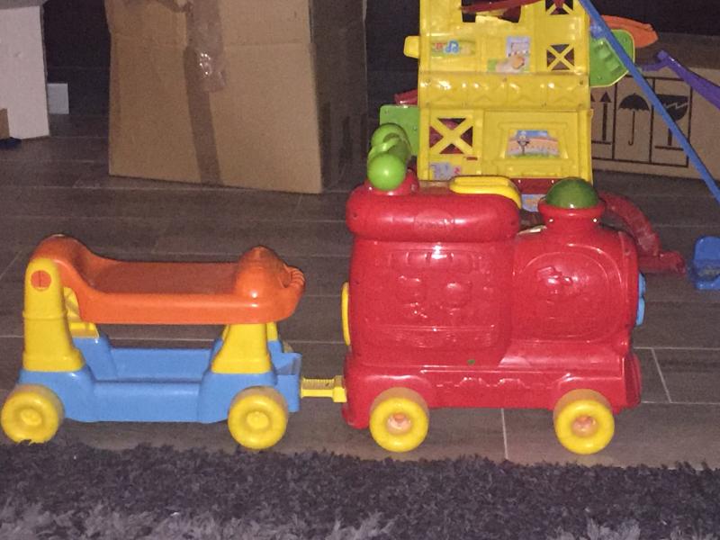 Este tren es una distracción inacabable para el peque. Le sirve de andador, se sube encima y empuja con los pies.. tiene muchas luces, colores, sonidos de animales y letras. Cada pieza suelta te enseña una letra. Y además se pueden apilar entre ellas y hacer castillos. Se lo pasa en grande. La contra es el precio que es alto - Ventajas: