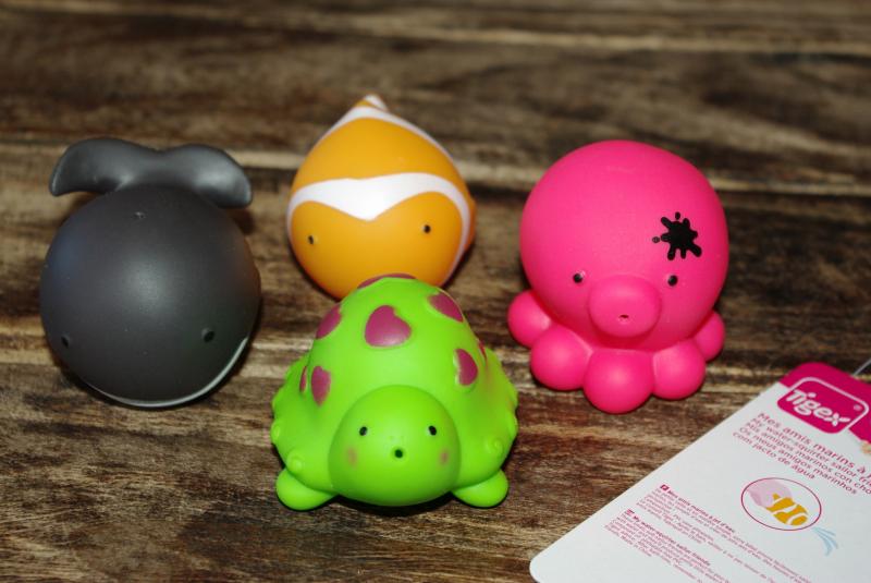 Nos regalaron este juguete cuándo nació nuestra hija y al principio no les hacía ni caso, pero ahora, con 6 meses y medio, le llaman muchísimo la atención y hacen del baño un momento muy divertido. Son unos juguetes muy sencillos, con diferentes formas de animales marinos, blanditos y con un agujerito para llenarlos de agua y echar un chorrito de agua. Además el precio es muy asequible. - Ventajas: