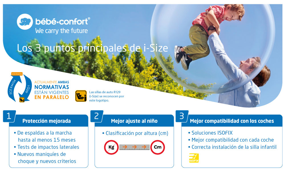Antes de julio de 2013, los bebés podían viajar en una silla de auto de cara a la marcha aproximadamente a partir de los 9 o 12 meses, pero los estudios demostraron que esa edad no era la adecuada para ir de cara a la marcha. Con la nueva normativa, es obligatorio que los niños viajen en posición de espaldas a la marcha hasta, como mínimo, los 15 meses. Dado que se puede elegir la silla de auto i-Size en base a la altura y no en función del peso, el bebé podrá usar la silla durante más tiempo. A menudo, los padres conocen mejor cuánto miden sus hijos que cuánto pesan y por eso tendrán mayor facilidad en la elección de la silla.