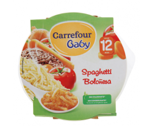Información Alimentaria: Ingredientes: pasta alimenticia compuesta con clara de huevo cocida “spaguetti” 27% (agua, sémola de trigo duro, clara de huevo en polvo), concentrada de tomate 21,2%, zanahoria 18%, agua, carne de vacuno 9,2%, cebolla 6%, almidón modificado de maíz, aceite de oliva virgen extra, sal, ajo en polvo, azúcar, orégano en polvo.