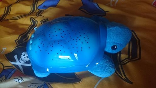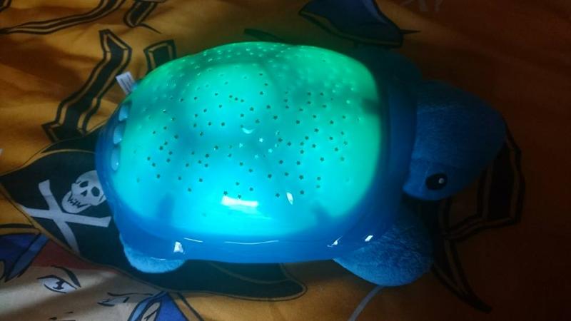 Es una lamparita de noche demasiado sencilla. Tiene tres colores a elegir (verde,azul y rojo) y proyecta estrellas y la luna. No lleva ni música ni movimiento, por lo que no les llama demasiado la atención. Como diseño y tacto si que es bonita y agradable, pero al tener el caparazón duro tampoco es un peluche. - Ventajas: