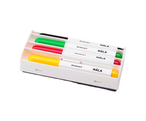 Con estos rotuladores pintamos y escribimos en la pizarra de ikea. La lástima es que sólo están en estos cuatro colores. Pero son colores vivos, el tamaño es ideal para que los pueda coger con su mano y son lavables. No queda ninguna marca después de escribir y borrar. Van acoplados a un borrador de tiza para usar para el otro lado de la pizarra. - Ventajas: