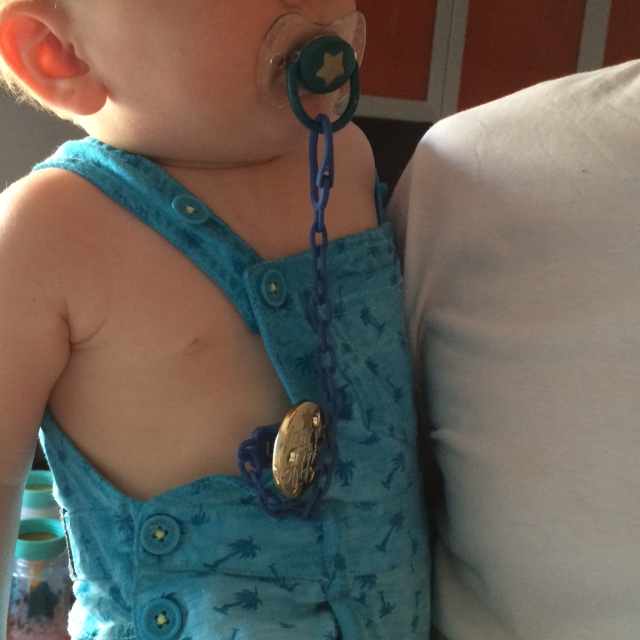 El sujetachupetes tb es precioso, es una pena que no combine con el chupete ya que uno es marrón y el otro morado pero bueno esta muy bien , lo único que para lavarlo hay que tener cuidado no mojar la chapita dorada ya que se le va el baño .