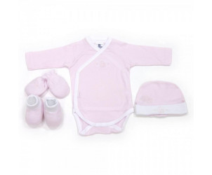 Conjunto de cuantro piezas para la primera puesta del recién nacido compuesto por body de manga larga, calcetines baby, manoplas y gorrito.