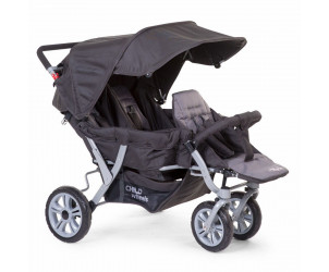 En la silla de paseo para trillizos Childwheels Triplet dos niños se sientan detrás y la tercera o el tercero delante. Gracias a esta construcción se consigue que la silla sea relativamente compacta y no tan ancha como si estuvieran los asientos uno al lado de otro. El robusto chasis dispone de dos grandes ruedas giratorias en la parte delantera. De esta forma se consigue una agilidad y maniobrabilidad a la hora de girar incomparable a otras sillas de trillizos. Cuando vayas por calles con adoquines o por un camino rural, fijas la posición de las ruedas giratorias. De esta forma se garantiza la marcha recta y es más fácil empujarla.
