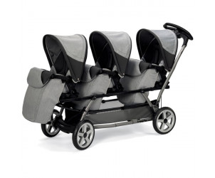 La silla de paseo para trillizos Peg Perego Triplette conquista por su confort, su lujoso equipamiento y su moderno diseño. Cumple sobradamente con las expectativas que tienen los padres de trillizos a la hora de elegir una silla de paseo adecuada. Para rematar: tiene un volante con el que superar sin esfuerzo las curvas y girar con agilidad. Con la silla de paseo para trillizos Triplette los paseos por la ciudad o por el campo son muy divertidos. En este modelo de silla para trillizos los bebés se sientan uno detrás del otro para que los padres de trillizos puedan pasar sin problemas por puertas y calles estrechas. La silla para trillizos cabe por cualquier pasillo y permite hacer las compras sin estrés.