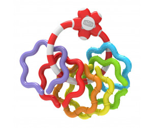 Mordedor asequible y atractivo para el bebé por sus colores llamativos. Sus aros son fáciles de coger, pero iría buen que fueran un poquito mas gruesos. Se pueden enlazar según te guste y son fáciles de encajar - Ventajas: