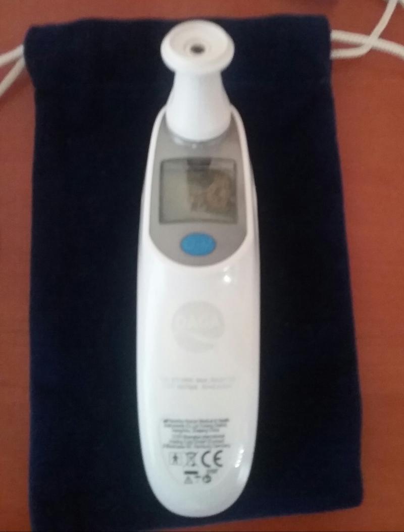 Para la toma de la temperatura en el oído, hace falta colocar un protector desechable al termómetro, si no es así, el aparato no hace esta función. El termómetro viene con 20 unidades que todavía no he terminado. Me preocupa un poco que me cueste encontrar recambios en la farmacia. Además viene con un protector rígido para poner en el cabezal cuando no se usa y una bolsa de terciopelo para guardarlo todo.
