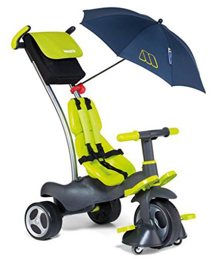 Este triciclo es muy completo y se puede usar desde que el chiqui es bastante bebé ya que tiene una opción de quitar los pedales y llevarlo arrastrando. El niño va ligado con un cinturón, tiene el parasol para los momentos de calor y una bolsita para guardar cosas - Ventajas: